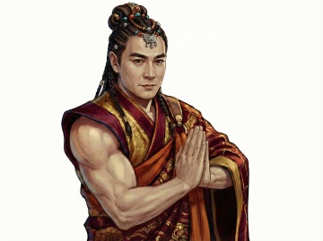 国潮风与3D重拟物结合,水墨光影交织,人物身着鎏金华服,面带神秘符文,立于云雾缭绕的古殿前,营造出沉郁而庄严的古典东方奇幻氛围。