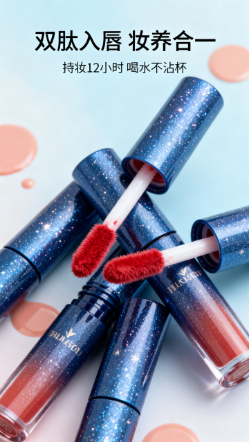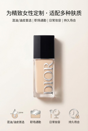 现代感与清新感交织,轻拟物风玻璃瓶身搭配极简主义陈列,柔和色调营造舒适氛围,实景感妆台背景强化时尚质感。