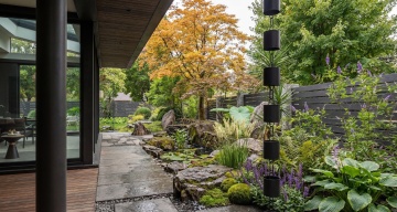 现代简约风格庭院设计,雨后湿润的黑色方形石板地面,倒映着周围绿植与建筑的光影,深色木质与黑色金属框架的现代建筑,落地玻璃门透出室内暖黄色灯光,室外黑色防腐木平台上摆放着深灰色布艺沙发组合,带有黄色靠垫,周围环绕茂密的绿色乔木与灌木,低矮的修剪整齐的草坪,小径旁点缀着小型绿植,整体呈现宁静、自然、高级的氛围,光影柔和,色彩以黑、深灰、绿色为主调,构图注重几何线条与自然元素的平衡。