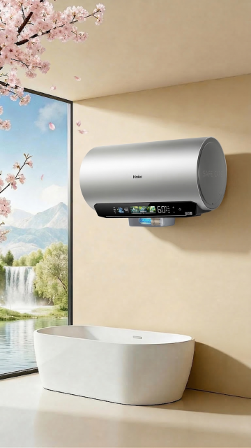 3D渲染风格浴室场景,主色调为纯净的白色与温暖的米色,搭配金色水龙头点缀,柔和的自然光从巨大的落地窗洒入,窗外是壮丽的雪山远景,光线在光滑的地面形成明亮的反光与柔和的阴影。画面中央是一个现代简约风格的白色浴缸,边缘搭着一条白色毛巾,金色水龙头正流出清澈的水。浴缸后方的米色立柱上安装着白色的热水器,下方壁龛内整齐摆放着折叠的白色毛巾和透明瓶身的洗护用品。整体氛围宁静、高端、充满自然光线与开阔视野,展现出极简主义的优雅与舒适。
