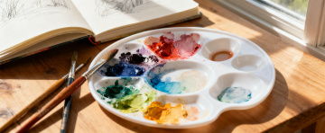 光影洒落木桌,水彩盘斑斓如诗,手账风素描本静伴,文艺清新中透出印象画派的朦胧意境。