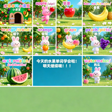 6个不同造型的拟人水果角色,采用可爱卡通风格,圆润的身体和四肢,大大的眼睛和微笑表情,每个水果都有独特的拟人化特征(如草莓戴蝴蝶结、香蕉戴墨镜、苹果举着小花等),鲜明的色彩搭配,上下两行各3个整齐对齐排列,浅色背景,整体呈现欢快活泼的氛围。