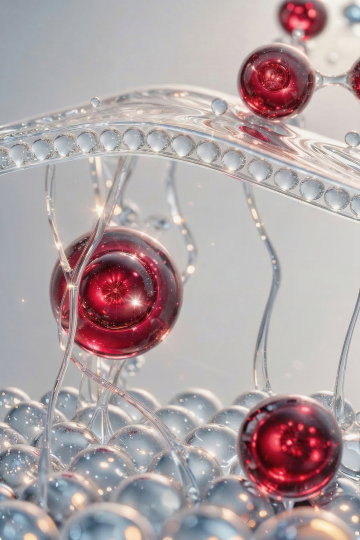 超写实3D质感,以柔和明亮的粉紫色调为主色系,搭配淡金色的高光和浅灰色的背景,营造出梦幻而纯净的氛围。画面中心及周围分布着多个透明的球形细胞结构,细胞膜呈现半透明的光泽感,内部填充着渐变的粉紫色液体,液体内有大小不一的气泡和类似分子结构的悬浮颗粒。细胞之间由光滑的透明曲线连接,底部有波浪状的透明流体形态,整体元素按照从大到小、从中心到四周的规律进行规整排布,保持对称平衡的构图。光线从上方柔和照射,在细胞表面形成细腻的高光和柔和的阴影,背景中点缀着模糊的小气泡,增强画面的层次感和空间深度,整体视觉效果通透、精致、富有科技感和高级感。