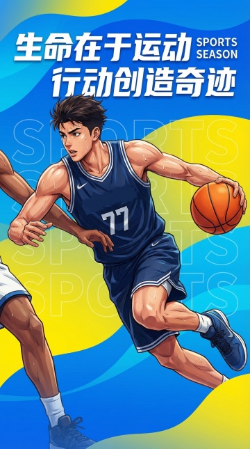动漫风格插画,一位男性网球运动员正全力挥动球拍击球的瞬间,红色运动服搭配深色短裤,白色运动鞋与长袜,背景由大块面的蓝色、白色和红色几何色块构成,呈现出动态的倾斜角度和速度感,线条流畅且富有张力,整体色彩鲜明对比强烈,人物姿态舒展充满力量,画面传达出运动的激情与活力,扁平化设计语言,简洁而富有冲击力的视觉效果。