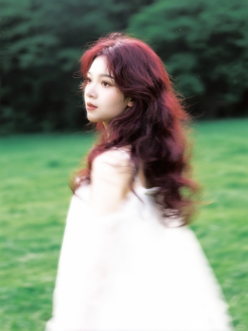 在绿色的草地上,一个穿着梦幻白纱的少女,动态模糊