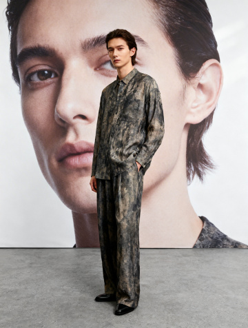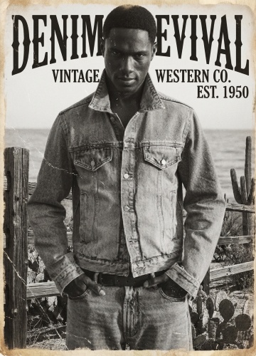 现代简约风格,融合时尚与商务感,抽象面料纹理彰显质感,人物与巨幅肖像呼应,营造潮流视觉张力。