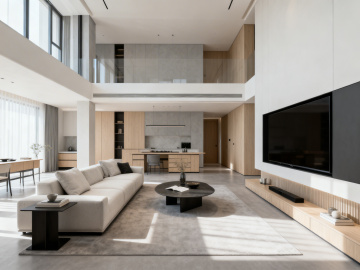 全景视角,高清画质,3:4比例。一间现代简约风格的豪华酒店卧室,视角正对床头与背景墙。环境光线极暗,仅由暖黄偏红光(色温1250K,照度低于10lux)勾勒轮廓。光线主要来自:1. 床头背景板上方一条细长的间接洗墙灯带,发出柔和均匀的漫射光;2. 天花板凹槽内隐藏的灯带提供基础环境照明。床头柜上放置着一台设计精致的迷你香薰机(类似无印良品风格)和一个有质感的织物面小型音响。床头柜表面集成了一块极简