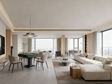 现代简约风格卧室,以浅米色和原木色为主色调,整体明亮温馨。中央摆放一张米色布艺软包床头的双人床,床上铺着米白色床单和浅色针织毯,搭配多个同色系枕头。床的右侧是一个原木色床头柜,上面放着一盏白色台灯和一个白色杯子。床的左侧靠墙处有一个原木色多层搁板架,摆放着绿植、装饰品和书籍。房间左侧有一扇大窗户,挂着浅米色落地窗帘,窗边放着一把浅色单人椅和一个小圆木桌。墙上挂着一幅花卉装饰画和三个立体花朵装饰。天花板有嵌入式灯带,营造出柔和的间接照明效果,地面铺着浅灰色地毯,整体空间干净整洁,光线充足,充满舒适宁静的居家氛围。