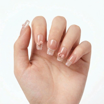 一只女性的手,手型自然舒展,手指微微弯曲,掌心朝向内侧,指尖微微上扬,保持纯白色背景,指甲修剪为圆润的方形甲,甲面光滑饱满,涂有带有细闪的蜜桃粉色渐变美甲,美甲表面有镜面般的高光反射,边缘线条清晰,整体呈现出细腻的皮肤质感和精致的美甲光泽。