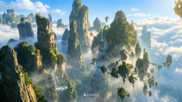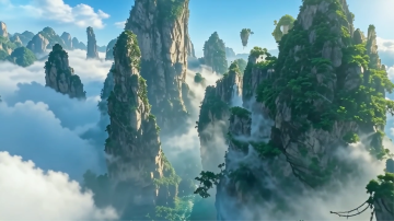 水墨风与插画风交融,云海缭绕山巅,光影流转间透出梦幻与神圣感,松柏苍劲,剑气如丝,唯美的虚拟自然画卷,静谧中蕴藏神秘东方意境。