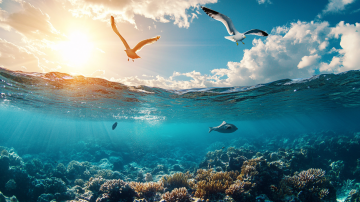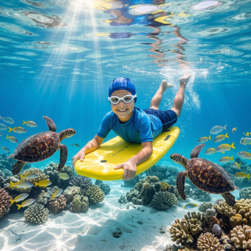 超写实风格水下场景,阳光穿透清澈湛蓝海水形成多束明亮光束,照亮海底五彩斑斓的珊瑚礁生态系统。前景是形态各异的健康珊瑚群落,包括巨大的红色脑珊瑚、橙色扇形珊瑚、紫色鹿角珊瑚和黄色块状珊瑚,珊瑚表面细节丰富,纹理清晰可见。中央区域有一条姿态优雅的蓝白条纹小丑鱼群和几条黄色与黑色相间的蝴蝶鱼,周围环绕着银色闪光的沙丁鱼群和几只色彩鲜艳的鹦鹉鱼,所有海洋生物动态自然,细节精致。背景海水呈现出由浅至深的渐变蓝色,水面有轻微波纹和光斑反射,整体画面光影对比强烈,色彩饱和度高,营造出梦幻而生机勃勃的热带海洋氛围,具有极高的摄影级清晰度和真实感。