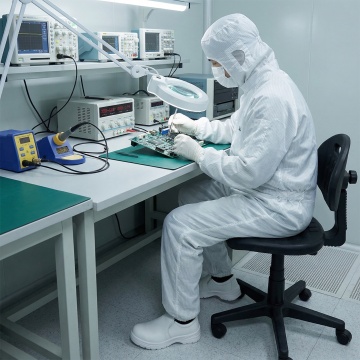一个干净规整的现代化实验室场景,采用写实风格,以蓝白色调为主,光线明亮柔和,具有清晰的光影层次和细腻的质感表现。画面中可见身着白色防护服的研究人员在先进的白色和蓝色精密仪器设备旁工作,背景是带有规则几何图案的白色墙面。构图采用三分法,空间感强,整体氛围专业、严谨、科技感十足,适合作为背景使用。