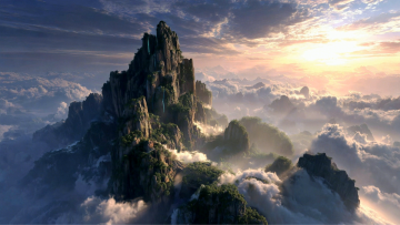 水墨风与插画风交融,云海缭绕山巅,光影流转间透出梦幻与神圣感,松柏苍劲,剑气如丝,唯美的虚拟自然画卷,静谧中蕴藏神秘东方意境。