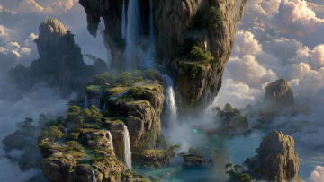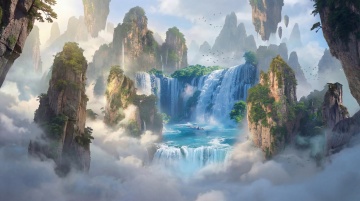 梦幻缥缈的悬浮山峦,水雾缭绕间瀑布飞泻,3D虚幻自然与油画质感交融,光影流转中尽显唯美感与超现实意境。