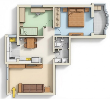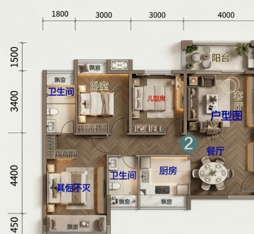 现代感3D立体户型图,融合重拟物与简约主义,塑料风质感搭配玻璃风透明元素,营造舒适温馨的家居氛围。