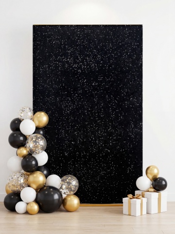 3D渲染风格,白色背景,中央放置几个大小不一的深蓝色礼盒,礼盒表面有光滑质感,系着银色蝴蝶结,礼盒上方漂浮着一组深蓝色和银色相间的气球,包含圆形和星形两种形态,气球表面有细腻的高光和渐变效果,周围散落着银色的五角星形状的彩带和亮片,整体光影柔和,光源来自左上方,营造出节日庆典的欢快氛围,画面构图饱满,视觉焦点突出,具有清晰的视觉层次结构。