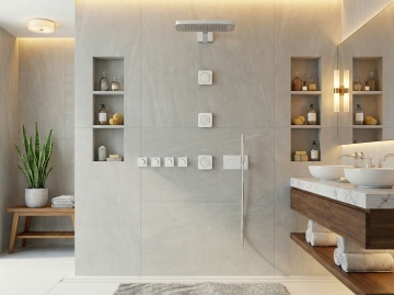 极简主义风格的卫生间室内设计,整体采用米白色与浅木色的柔和配色方案,温暖的嵌入式灯带与顶部筒灯提供均匀柔和的照明,营造明亮通透的氛围。墙面和地面铺设大块浅色哑光瓷砖,线条简洁流畅。不同场景下的卫生间摆设:有的配备悬挂式白色洗手台,台面整洁,搭配简约白色水龙头,上方是带储物功能的镜柜,旁边装有黑色金属毛巾架;有的设置独立玻璃淋浴房,内部有壁龛收纳洗浴用品,黑色淋浴喷头与五金件形成精致对比;有的墙面悬挂线条简约的黑白花卉装饰画,下方嵌入木质灯带壁龛,摆放香薰和装饰摆件;有的空间内放置智能马桶,旁边设有带木质搁板的收纳区。整体设计注重功能性与美学的平衡,空间布局合理,细节处理精致,呈现出现代、干净、舒适的卫生间环境。