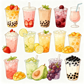 清新插画风,卡通拟人饮品,色彩明亮,趣味十足,展现夏日清凉感。