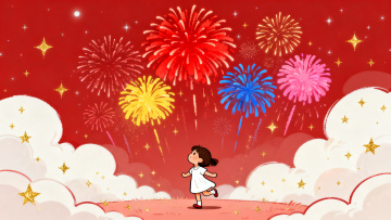 水彩风插画,梦幻绚烂的烟花点亮夜空,一家三口仰望星空,温馨喜庆,融合动漫与浮世绘元素,营造节日欢愉氛围。
