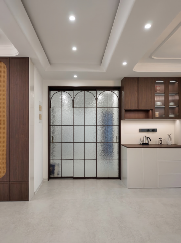 一张现代极简风格的卧室局部特写,温暖柔和的暖黄色间接光源从床头板后方和侧边墙面灯带透出,照亮深棕色实木床头板与床头柜的细腻木纹质感,床头柜上放置着一个插有黄色小花的花瓶,床上铺着浅灰色床单与米白色枕头,整体色调以深棕、灰色、米白为主,营造出宁静、舒适、高级的居家氛围,光影过渡自然柔和,材质细节清晰可见,具有强烈的现代简约设计感与温馨的生活气息。