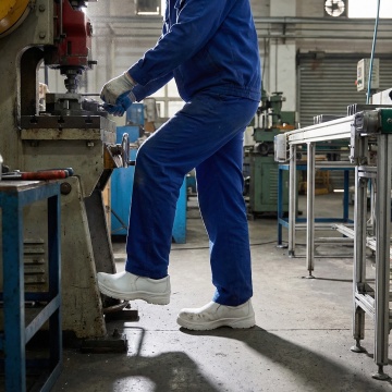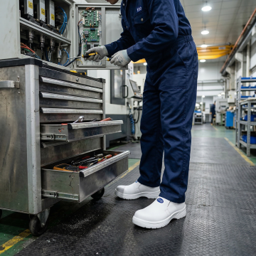 明亮的未来主义风格工厂内部,高科技自动化生产线整齐排列,精密数控机床与机械臂高效运作,身着白色工作服的技术人员在洁净的车间内巡查,柔和的白色与金属银灰色调为主,点缀蓝色科技光效,高天花板上矩阵式LED灯光提供均匀照明,地面光洁如镜反射设备轮廓,整体呈现出高度现代化、秩序井然且充满科技感的先进制造氛围,空间开阔,设备布局科学合理,传达出高效、精准、创新的工业美学。