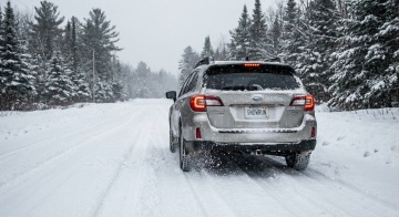 夜雪公路,车内视角,霓虹路牌映衬静谧夜景,光影交错,玻璃窗折射冷冽蓝调,科技感与实景融合,宽阔视野尽显深邃氛围。