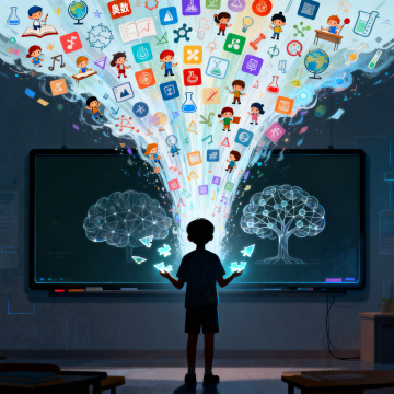 科技感十足的3D重拟物风设计,融合霓虹灯与金属质感,展现未来AI教育场景,虚拟现实元素点缀,突出商务与创新氛围。