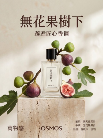 优雅奢华的香水瓶置于木雕风底座,搭配柔和插画风花卉,简约主义设计,尽显高贵。