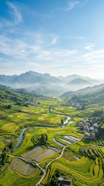 背景是层峦叠嶂的青绿色山脉,山间薄雾缭绕,远处田野呈现柔和的色块,阳光透过枝叶洒下斑驳的光影,整体色调温暖清新,画面充满丰收的治愈感