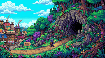 插画风的虚拟自然景观,清新舒适,小径通向森林深处的小屋,营造宁静氛围。