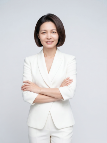 参考第一张图保留人物脸型、年龄等特征生成职场形象照,参考第二张图人物占位和比例,标准焦段50mm,F/4光圈(F/2.8-F/4区间),平视视角(镜头与人物视线齐平);人物占画面70%,人物居中(居中构图),位于画面中心,为视觉聚焦点,入境范围头部及以下至臀部下方10cm(半身像);左右留少量背景空间;头部与画面顶部保留5%空间;头部发型完整;肤质白皙细腻,头肩比例协调,美颜磨皮韩式精致自然的浓妆