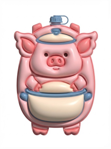 软3D风格的拟人小猪水壶,融合可爱与卡通元素,塑料质感十足,萌趣十足。