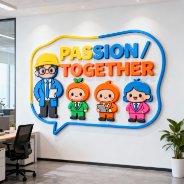 卡通感插画风,大字“WORK”环绕办公场景,色彩鲜明,创意生动。