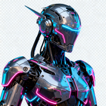 赛博朋克风3D机甲战士,金属质感搭配霓虹粉蓝光效,未来科技与机能美学融合,酷炫十足。