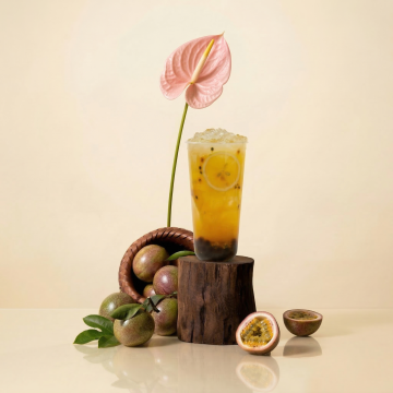 中式美学意境,轻拟物风搭配木雕质感底座,草莓饮品层叠如云霞,柔光渲染出唯美感与清新感,布艺与枝叶点缀,质朴中见细腻。
