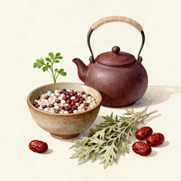 六个规整排布的中药主题插画系列素材集合,每个元素均采用复古手绘线稿风格,搭配温暖的棕色、赭石色和橄榄绿为主色调,细节处有细腻的纹理和阴影表现。包含:1. 左侧:一本翻开的古籍书页上放置着几株完整的人参,书页旁散落着几颗饱满的枸杞,背景有缠绕的麻绳;2. 右上:一个深色陶罐中插着干燥的艾草束,罐身贴有空白标签,旁边点缀着几片艾叶;3. 右下:一个带木塞的玻璃瓶内装着切片的黄芪,瓶口露出几片黄芪饮片,下方散落着三两片甘草叶;4. 左上:一卷用麻绳捆绑的肉桂棒,旁边摆放着几颗完整的桂圆,背景有细小的肉桂粉末;5. 中间:一个竹制药杵旁放置着研钵,里面是捣碎的当归,旁边散落着当归切片和几根当归须;6. 左下:一个陶瓷药罐中插着几支金银花,罐口缠绕着藤蔓,下方有几颗散落的金银花蕾。所有元素均以纯色背景呈现,保持统一的复古手绘质感和中药类目主题,整体构图平衡,信息传达清晰,具有浓厚的传统医药文化氛围。