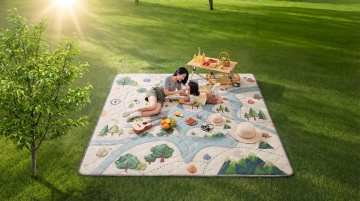 清新插画风,卡通人物野餐,轻拟物细节,展现春日欢乐氛围。
