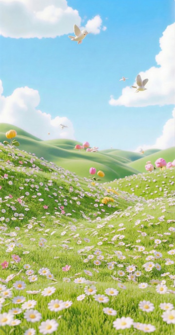 卡通风格插画,清新明快的绿色草地起伏不平,点缀着粉色、黄色和白色的小雏菊,天空是柔和的浅蓝色,飘着形态各异的白色云朵,整体画面采用手绘质感的笔触,色彩明亮柔和,营造出轻松愉悦的春日氛围。