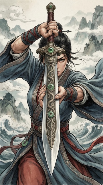 梦幻古典中式插画,仙人御剑飞行,云海缭绕,水墨风格渲染虚拟现实。