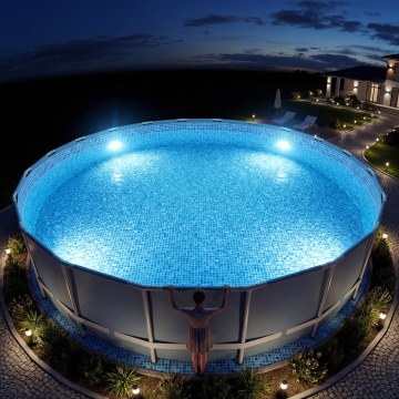3D风与重拟物结合,金属质感灯饰在夜色中投射柔和光影,营造静谧现代庭院氛围,实景感十足,极繁主义细节尽显舒适与优雅。