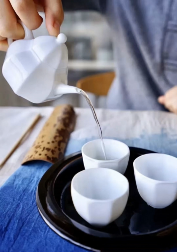 水墨风与工笔风交融,古典中式茶韵中透出朦胧梦幻感,静谧湖光映衬优雅仕女,浮雕质感的细节强化文艺意境。