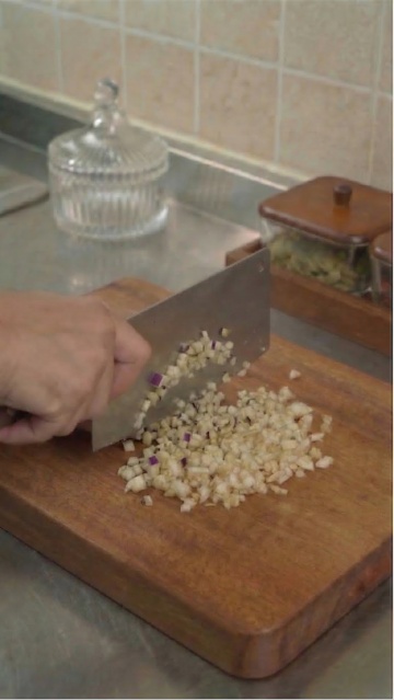 特写镜头下,不锈钢盆中铺满大量被切成小段的新鲜辣椒,辣椒段呈现出鲜明的色彩分区,从左到右依次为鲜亮的黄色、热烈的红色和清新的绿色,色彩过渡自然且对比强烈,辣椒籽与辣椒肉的纹理清晰可见,充满质感。一只手握着中式菜刀正从红色辣椒区域向下切剁,刀刃上沾着细碎的辣椒末,动态感十足,背景为深色,突出主体辣椒的鲜艳色彩和切割动作的生动性,整体画面光影柔和,聚焦于辣椒的丰富色彩和切割瞬间的鲜活感,营造出充满活力和烟火气的烹饪场景氛围。