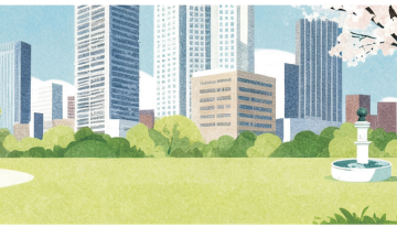 2.5D等距风格插画,白色背景,绿色草坪上一条蜿蜒的浅色小路,路的两侧有三排长椅,一位穿着黄色上衣和蓝色裤子的人正沿着小路行走,周围有几棵大树和灌木丛,点缀着红色的小花,整体画面色彩明亮,风格简洁,没有水印。