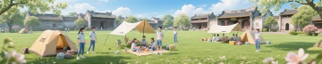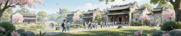 软3D风卡通男孩,可爱感十足,坐在行李箱上,背景是热闹的古街,充满节日氛围。