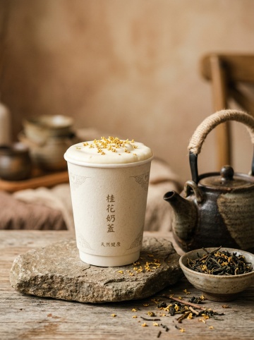 中式美学意境,轻拟物风搭配木雕质感底座,草莓饮品层叠如云霞,柔光渲染出唯美感与清新感,布艺与枝叶点缀,质朴中见细腻。