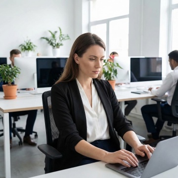 明亮的现代办公室环境,柔和的自然光透过大面积玻璃窗洒入室内,温暖的木质办公桌,桌上放着笔记本电脑、打开的笔记本、蓝色马克杯和一支铅笔,穿着米色开衫与白色衬衫的女性正在专注地使用笔记本电脑,背景有白色书写板、木质书架和简约办公家具,整体风格简约、专业、温馨,具有清晰的空间层次感和舒适的工作氛围,高清晰度,写实摄影风格,柔和光线,自然色彩。
