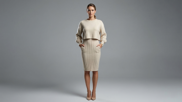 简约主义风格,融合优雅与商务感,柔和色调与质感面料营造舒适时尚氛围,实景空间衬托高级时尚格调。