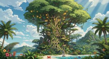 清新卡通插画风,沙滩椰树与破船相映,海鸥飞翔,夏日海岛冒险氛围。