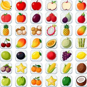 白色纯色背景上,以超写实主义风格呈现的6个完全不同的水果元素系列素材集合,每个元素均保持与原图一致的高细节质感、水润光泽表现、自然光影处理和规整排布方式:1. 一串饱满的红提,紫红色果皮带有光泽和水珠,附带绿色叶子和藤蔓;2. 一个完整的哈密瓜,橙黄色果皮带有绿色条纹,切开一半露出橙红色果肉和黑色种子;3. 一串香蕉,黄色果皮带有褐色斑点,自然弯曲的形态,顶部保留绿色果柄;4. 一个苹果,红色果皮带有黄色渐变,表面光滑有光泽,附带一片绿色叶子;5. 一串草莓,红色果肉表面布满黄色种子,顶部带有绿色草莓叶,呈现自然堆叠状态;6. 一个菠萝,黄色果皮带有菱形鳞片和绿色叶子,表面纹理清晰可见。所有元素均保持相同的光影方向、细节刻画程度和水润质感,整体布局规整对称,形成统一协调的水果系列素材集合。