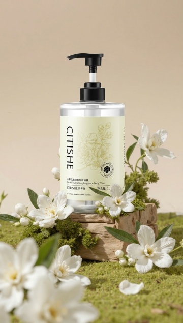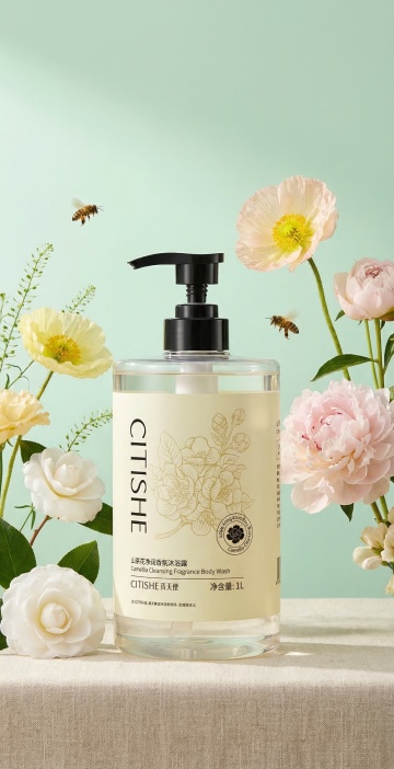 极简现代风洗发露,液态质感瓶身搭配柔和光影,清新绿植点缀浴室场景,传递清爽舒适与性冷淡美学。